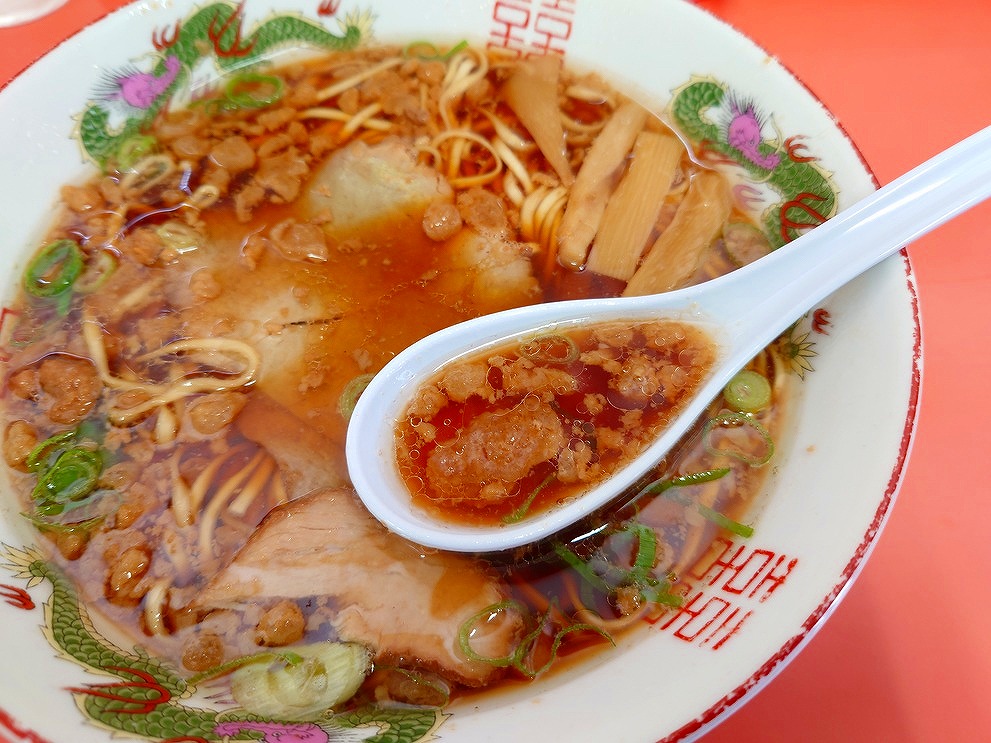 2022年06月01日 「朱華楼 川口店」 福山市川口町 今回は、こちらのお店に行ってみましたよ↑尾道ラーメンの老舗店(^^)↓お店に入り、メニューはこんな感じで以前と変わってない模様。↑ここは中華そばの大盛りが無いので、「そばセット」¥800をお願いします(^^)↓カウンター席の卓上はこんな感じ~↑コショーの缶が年季を感じさせますね(^-^;↓そして「そばセット」の登場で~す♪↑尾道ラーメンのオールドファンからすると、これこれ!って思わせる一杯♪いつものように麺が柔らかめなのが少し残念ですが、美味しい一杯でごじゃいます(^^)↑チャーハンは普通といった感じ。中華そばの大盛りがあると、最高なお店なんだけどなぁ~福山市川口町2丁目10-50 「外食(福山市)ラーメン・中華」カテゴリの最新記事 タグ :#朱華楼#尾道ラーメン#ラーメン#福山市 < 前の記事次の記事 > コメント コメント一覧 (13) 1. じんじん 2022年06月01日 11:10 大盛り欲しいですよね! 元がやわめな麺なので固め注文必須でしょけど(笑) チャーハンも好きなんですがパサっとしてる時があって、最近は普通のご飯を注文する様になりました(^^; 0 ハリセンボン がしました 3. ハリセンボン 2022年06月01日 17:56 >>1 じんじんさん、こんにちは! 麺の硬めって頼めるの知りませんでした(^-^; 今度は硬めコールしてみます^^; かなり昔ですが、チャーハンは一度に大量に作って後で炒め直す光景を一度見ましたよ。 今は解りませんが・・・。 麺の大盛りにほんと対応して貰いたいです! 0 ハリセンボン がしました 2. ここ 2022年06月01日 16:26 はじめまして(^o^) いつも楽しく読ませて貰ってます。 つい最近ラーメンを食べに久々に 朱華楼、川口店へ行きました。 もちろん麺固めで「そばセット」です。 お財布に優しい値段と 昔の懐かしい味に大満足でした。 これからも更新を楽しみに しています〜! 0 ハリセンボン がしました 4. ハリセンボン 2022年06月01日 18:00 >>2 ここさん、こんにちは! 楽しみして頂き誠に有難うございます。 更新がしんどくなってますが、なんとか頑張ってます^^; こちらのお店でも麺硬めでに対応してくれるの知りませんでした。 お値段も今ではかなり安いのが嬉しいですよね(^^) 0 ハリセンボン がしました 5. 匿名 2022年06月02日 15:03 感じの良い男の人と 注文しても返事もしない女の人の店 0 ハリセンボン がしました 7. ジエイ 2022年06月02日 15:57 >>5 同じく! 以前より少し感じ悪くなりました。 0 ハリセンボン がしました 11. ハリセンボン 2022年06月02日 18:34 >>7 ジエイさん、度々すみません。 女性の対応が悪いようなら、店主さんに指導して貰いたいものですね! 0 ハリセンボン がしました 8. ハリセンボン 2022年06月02日 18:26 >>5 匿名さん、こんにちは! 確かに女性の店員さんおられましたが、 私は気になる事はありませんでした。 0 ハリセンボン がしました 9. ハリセンボン 2022年06月02日 18:26 >>5 匿名さん、こんにちは! 確かに女性の店員さんおられましたが、 私は気になる事はありませんでした。 0 ハリセンボン がしました 6. ジエイ 2022年06月02日 15:55 私も同感です。 ライスを頼むと少なすぎます。 麺も少ない気がします。 昔は週2回は行ってましたが、最近は半年に2回くらいですかね~。 0 ハリセンボン がしました 10. ハリセンボン 2022年06月02日 18:32 >>6 ジエイさん、こんにちは! ここでライスを頼んだ事ないんですが、少量なんですね^^; 麺の量も減ったんですか?気づきませんでした(>_<) また行く機会あれば、色々と気にしてみますm(__)m 0 ハリセンボン がしました 12. ぼんびい 2022年06月04日 09:42 南手城のお店と比べ味はどうでしょうか? 麺の硬さを選べるのは嬉しいですね 今度行ってみます 0 ハリセンボン がしました 13. ハリセンボン 2022年06月05日 02:24 >>12 ぼんびいさん、こんばんは! 南手城のお店は数年前から味が薄くなって、川口店のほうが今は美味しいと個人的には思ってます(^^) 0 ハリセンボン がしました コメントフォーム 名前 コメント 記事の評価 リセット リセット 顔 星 情報を記憶 コメントを投稿する