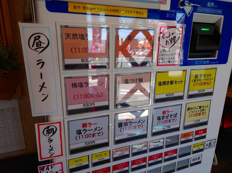 ↑朝の時間帯はお安くなるいたいで今回は朝ラーの「塩ラーメン」¥700と「麺大盛り」¥110だったか¥130だったか(お値段失念)の食券を購入します^^;