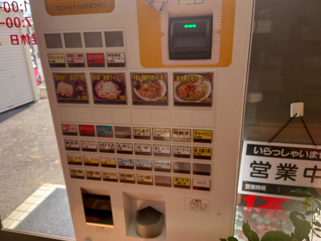 今回は一番安いメニューの「中華そば」¥650と「麺大盛り」¥100の食券を購入します(^^)