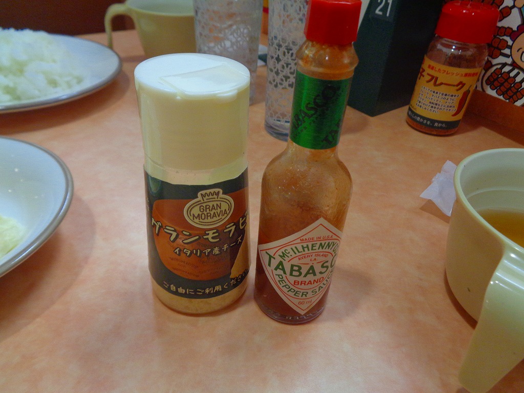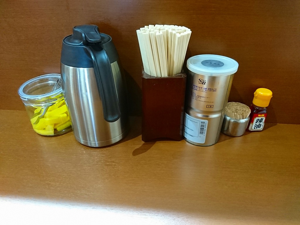 混み合ってたので店内の写真はないですが、テーブル席の調味料などはこんな感じ。