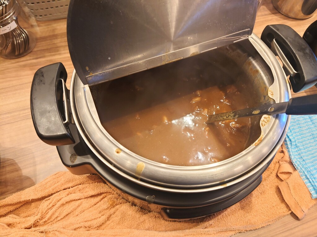 お鍋に結構お肉が入ってて、普通にお玉でカレーをかけても多めのお肉になりました♪