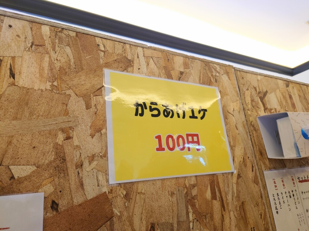 前回はラーメンを食べたので、今回は「中華うどん大盛」¥600と、「からあげ」1個¥100をお願いしてみます(^^)