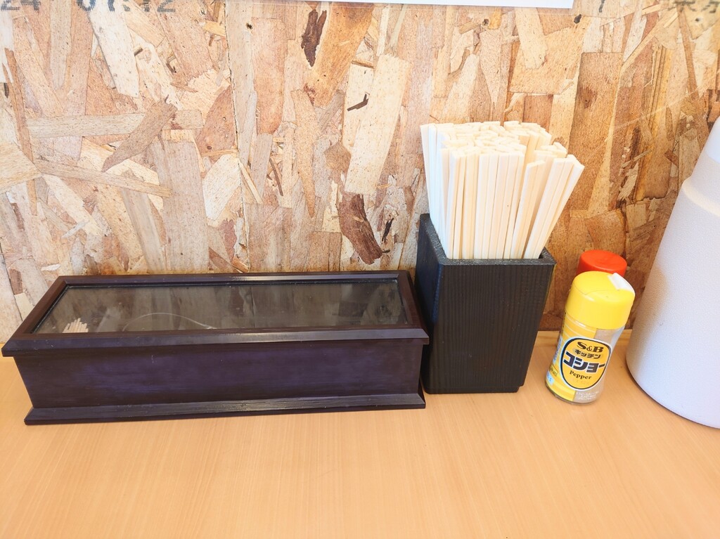 ↓座ったカウンター席に置いてあったコショーなど。
