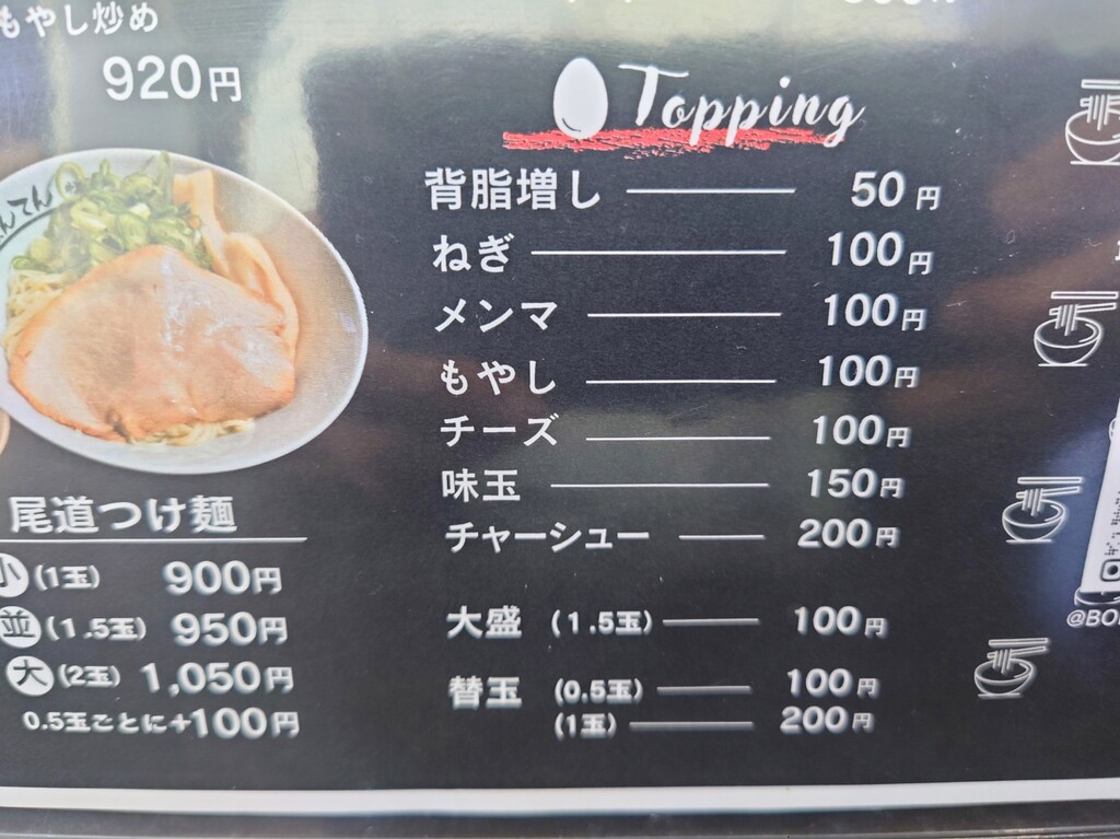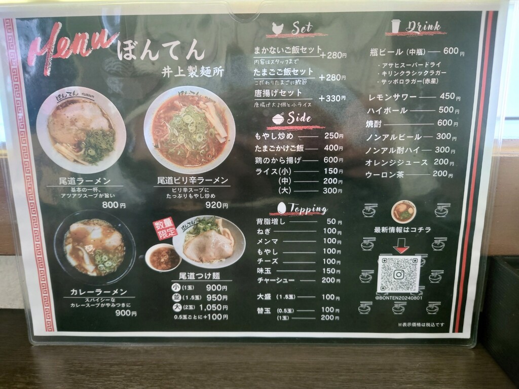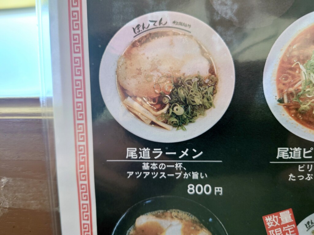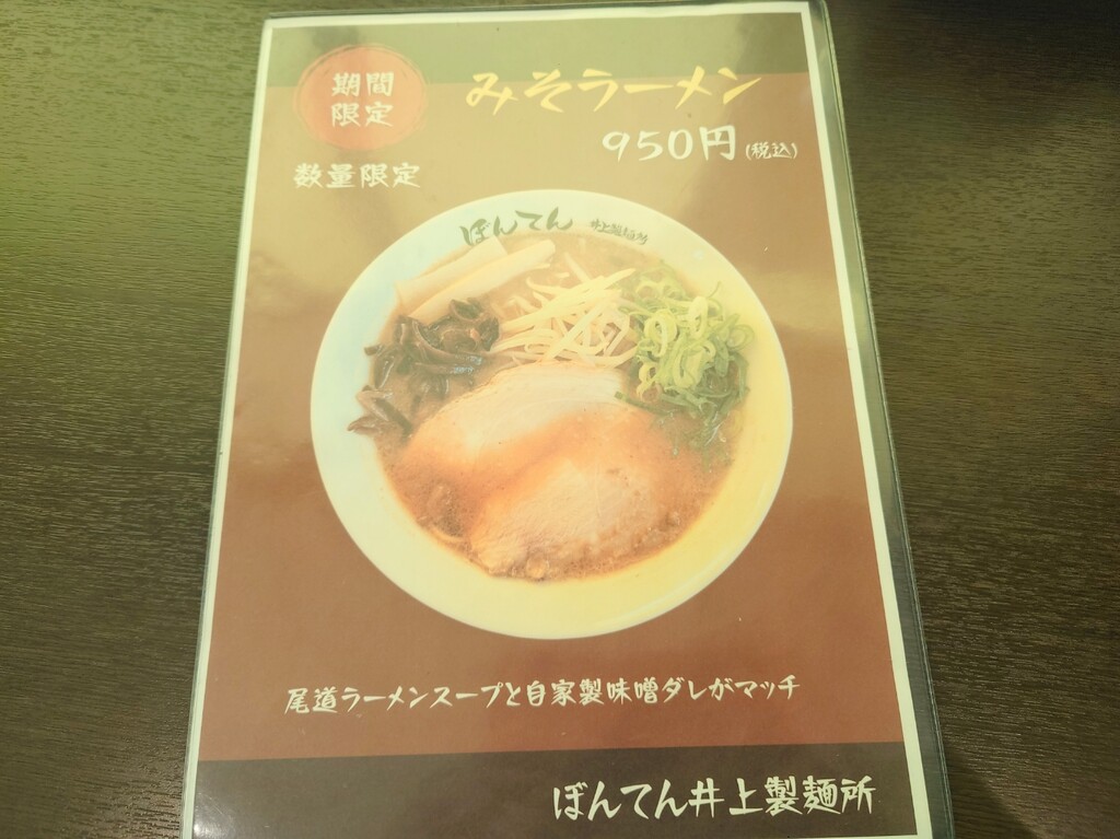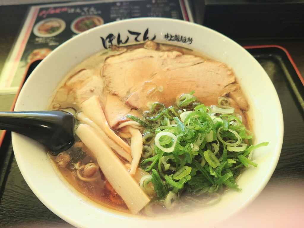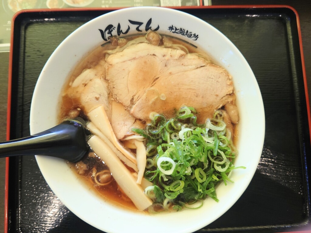2026年01月01日 「ぼんてん 井上製麵所」 福山市神辺町 今回は、こちらのお店に行ってみましたよ↓お店に入り、メニューはこんな感じ。↑今回は「尾道ラーメン大盛」¥900をお願いします(^^)↓座ったカウンター席はこんな感じ。↓そして、「尾道ラーメン大盛」の登場で~す♪↑こちらのお店がオープンした頃より少しはスープの味が濃くなりましたが、それでもまだ物足らなさを感じます。もっと醤油濃くて出汁効いてるほうがいいなぁ~^^;麺は硬めで出てくるのでいい食感(^^)つけ麺なら味もガラッと変わるでしょうから、いつかはつけ麺も食べてみたいです~福山市神辺町川南655-3 「外食(福山市)ラーメン・中華」カテゴリの最新記事 タグ :#ぼんてん#尾道ラーメン#ラーメン#福山市 < 前の記事次の記事 > コメント コメント一覧 (2) 1. akio 2026年01月02日 16:13 明けましておめでとうございます 今年もよろしく^^ そして楽しく地元のお店情報を楽しく読ませていただきます^^ しかし尾道ラーメンが800円ですか・・・。 自分の中では650円時代で止まっているのでお高く感じてしまいます(>_<) 0 ハリセンボン がしました 2. ハリセンボン 2026年01月02日 17:02 >>1 akioさん、明けましておめでとうございます。 akioさんのブログも毎日見てますよ(^^) もっと巻いて今の時期に近づいて欲しいところですが^^; 遠くへの観光などがしんどくて、今年も近場の飲食店の記事が多くなると思いますが、今年も宜しくお願い致します! 0 ハリセンボン がしました コメントフォーム 名前 コメント 記事の評価 リセット リセット 顔 星 情報を記憶 コメントを投稿する