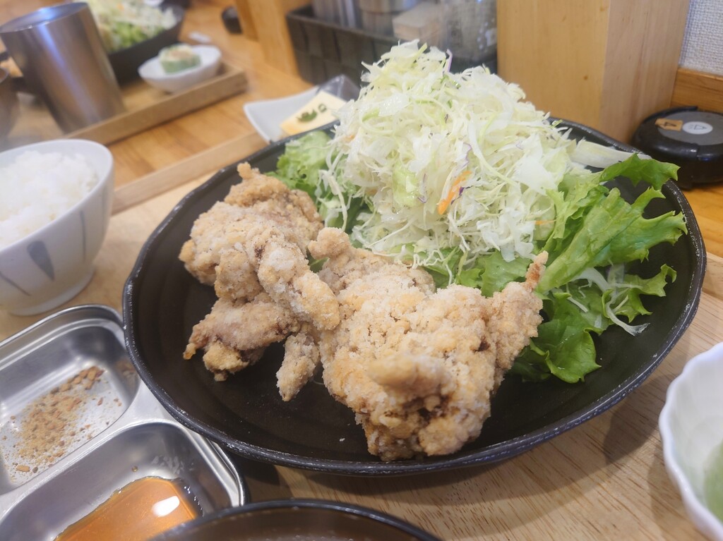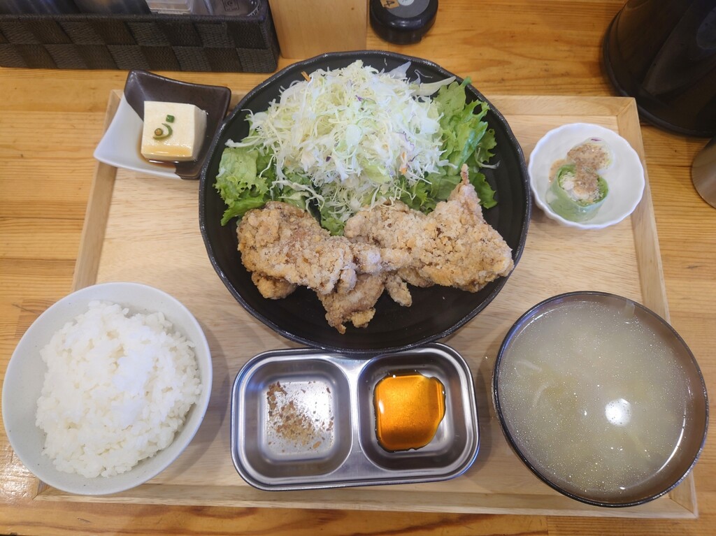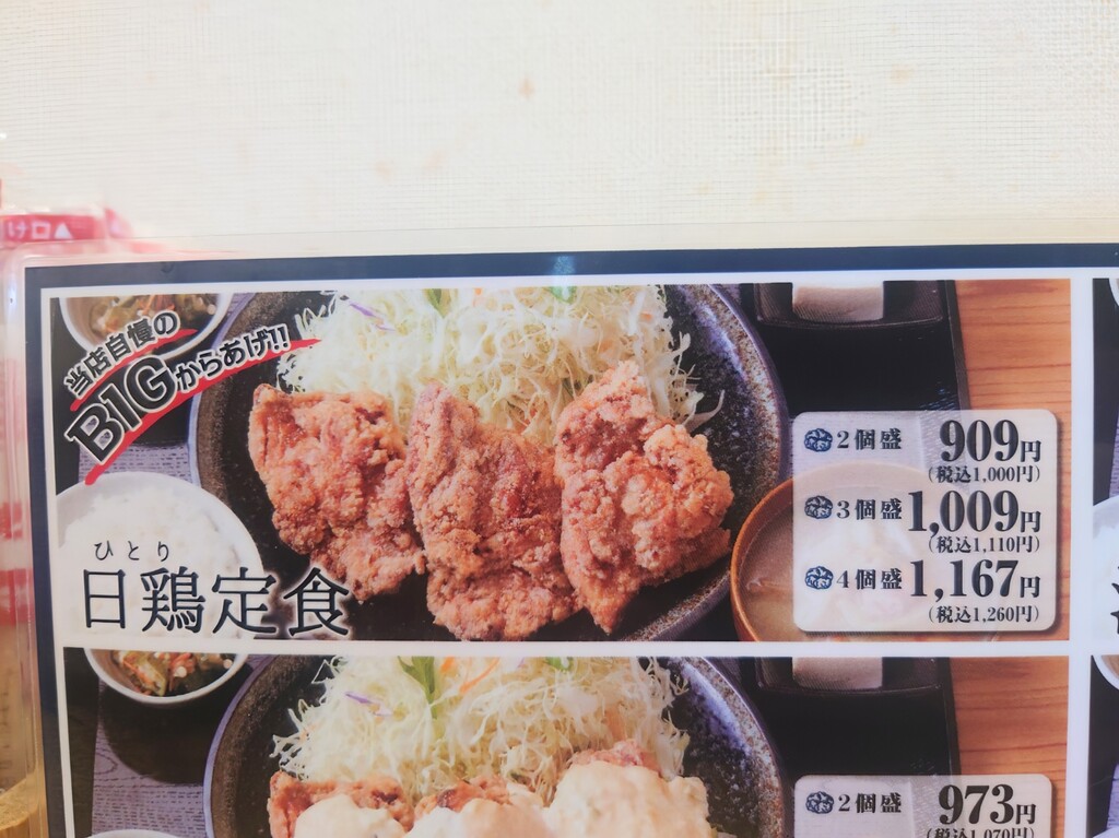 2個盛と3個盛どちらにするか迷ったけど、ここの唐揚げはかなり大きいので、「日鶏定食2個盛」¥1,000をお願いします(^^)