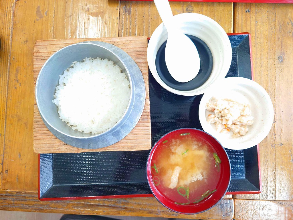 ↓定食なので、釜炊きご飯や汁物が運ばれてきてました。