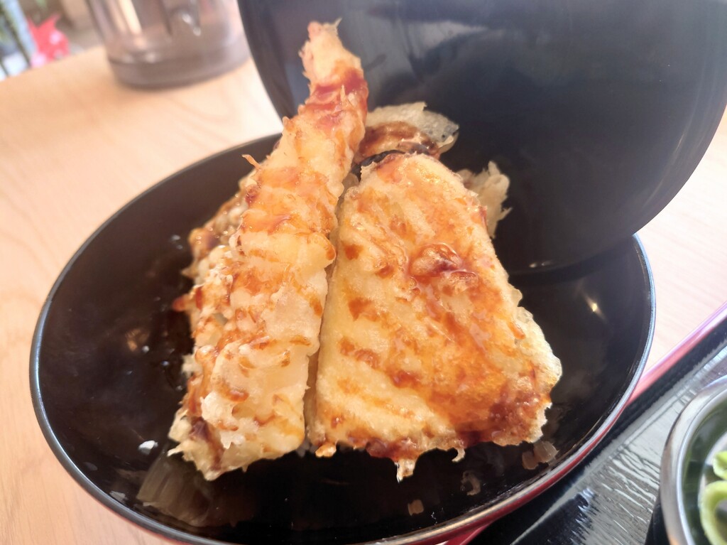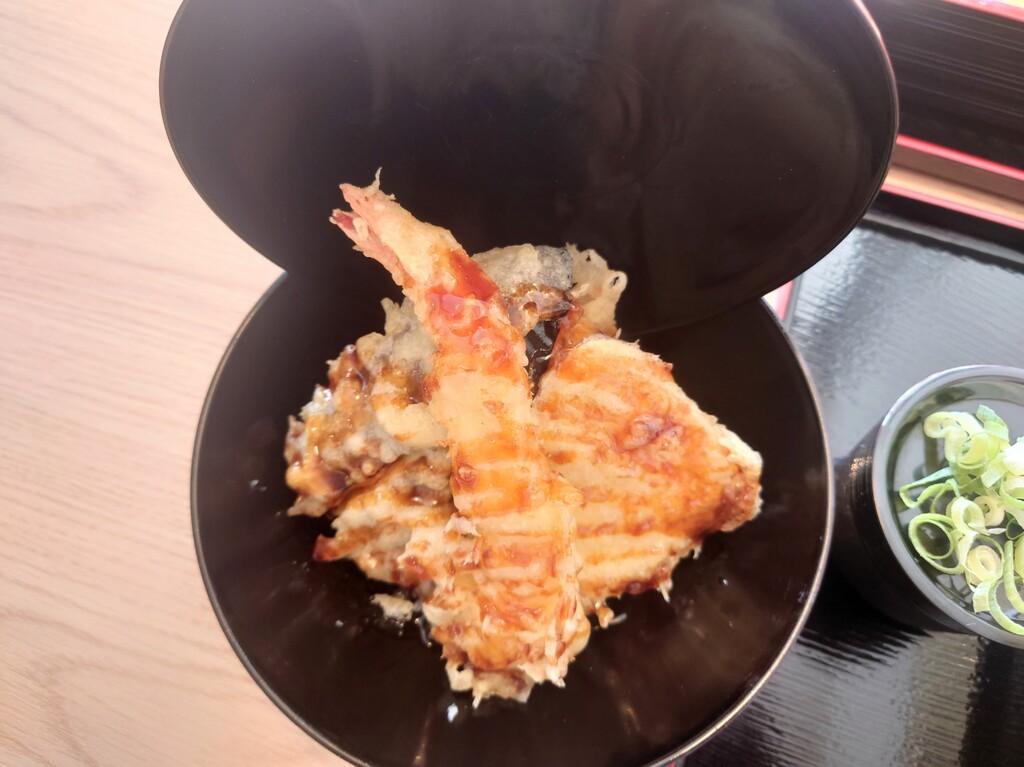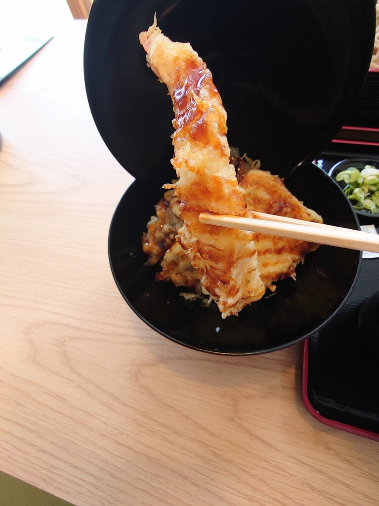 セット物の小サイズということでネタが小さいかと思ってたのですが、普通くらいの大きさで「海老」「茄子」「さつま芋」「半熟玉子」の天ぷらが乗ってて美味しい天丼でしたよ♪