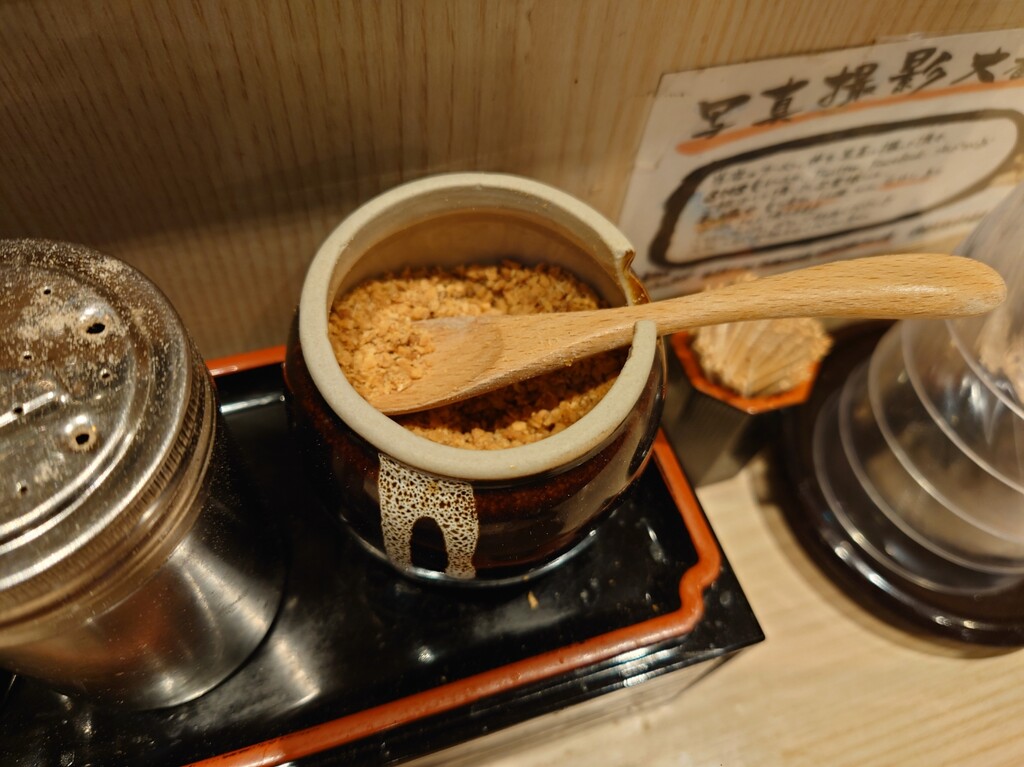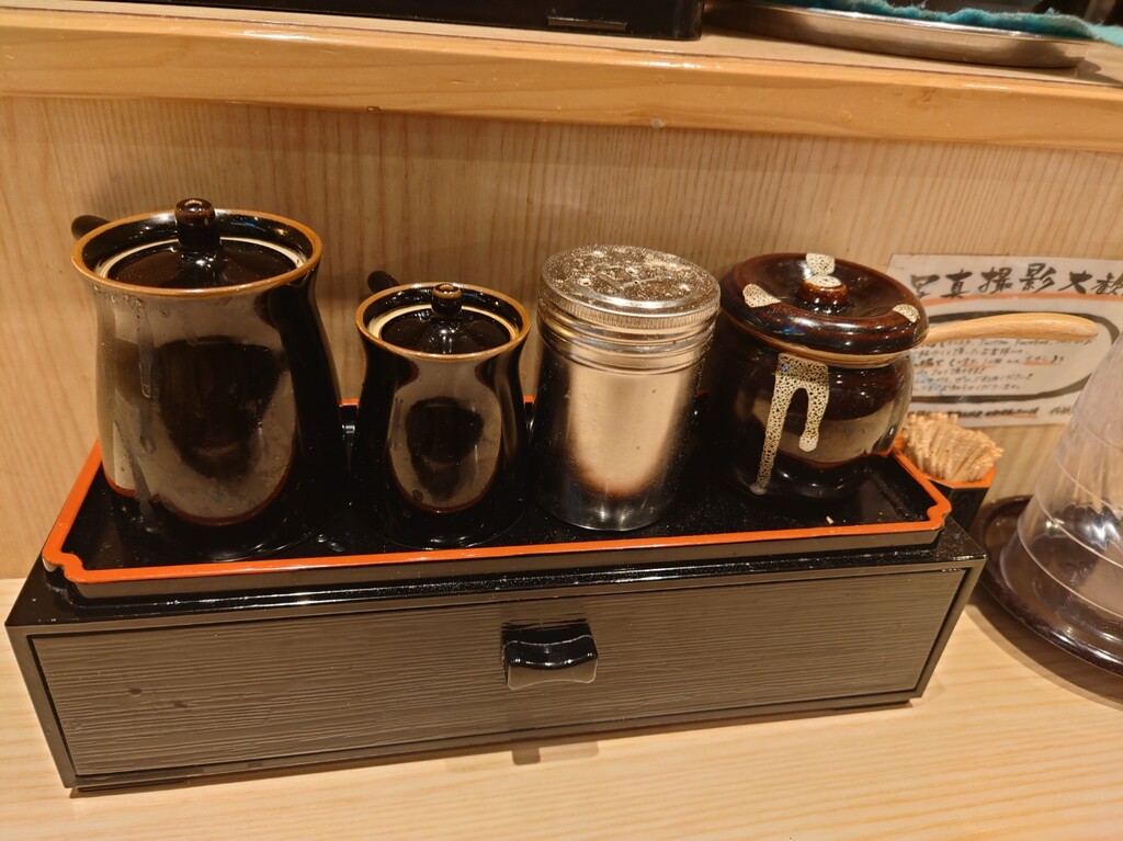 ↓座ったカウンター席の調味料などはこんな感じでしたよ。