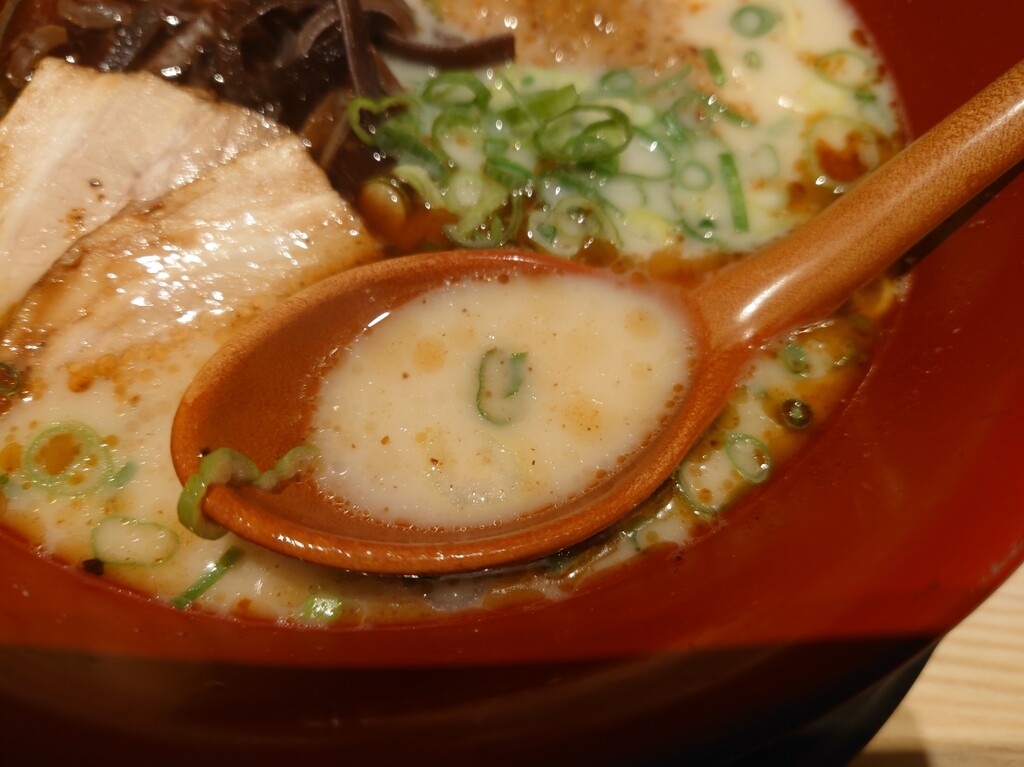熊本ラーメンのイメージは濃いめコッテリのスープのイメージでしたが、見た目や思ってたのと違って意外とあっさりとしたスープ。