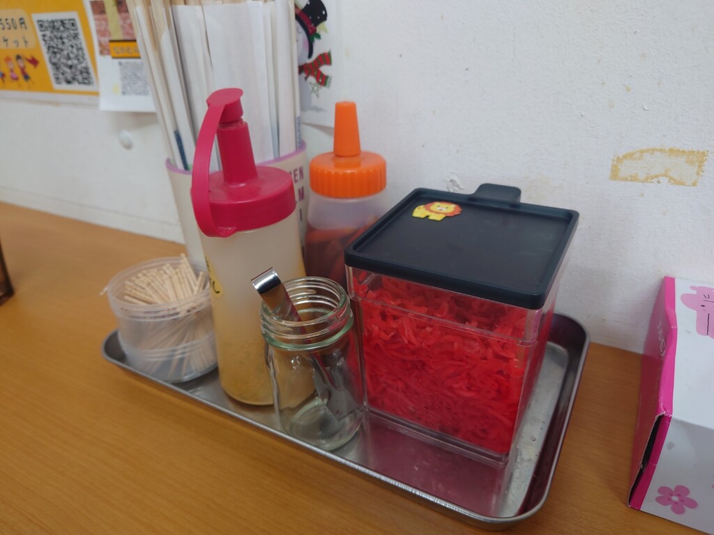 ↓座ったカウンター席の調味料などはこんな感じ。